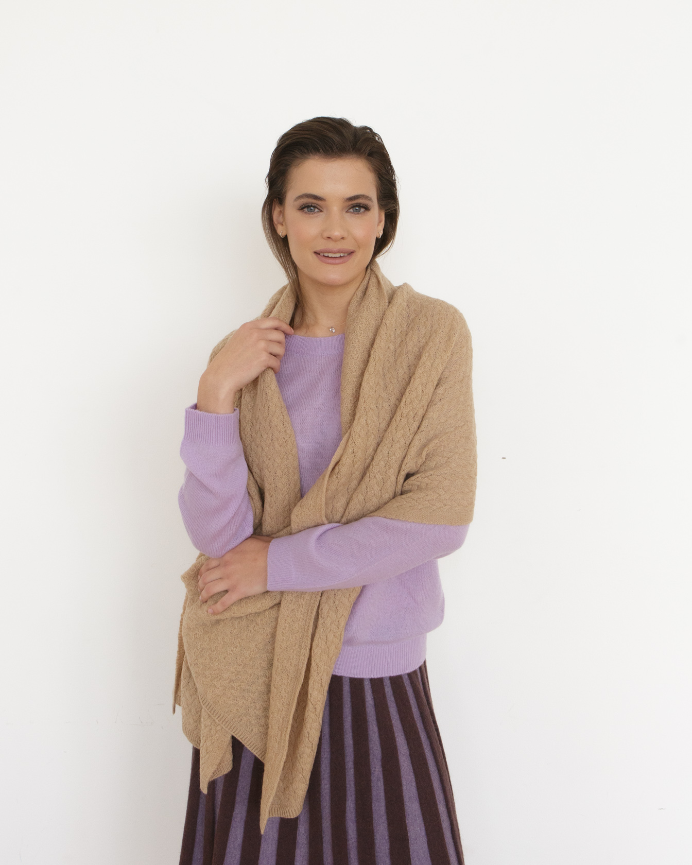 Классическая прямоугольная форма с аккуратной фактурной вязкой. Лаконичный дизайн подчеркивает натуральную красоту материала и делает палантин универсальным элементом гардероба.