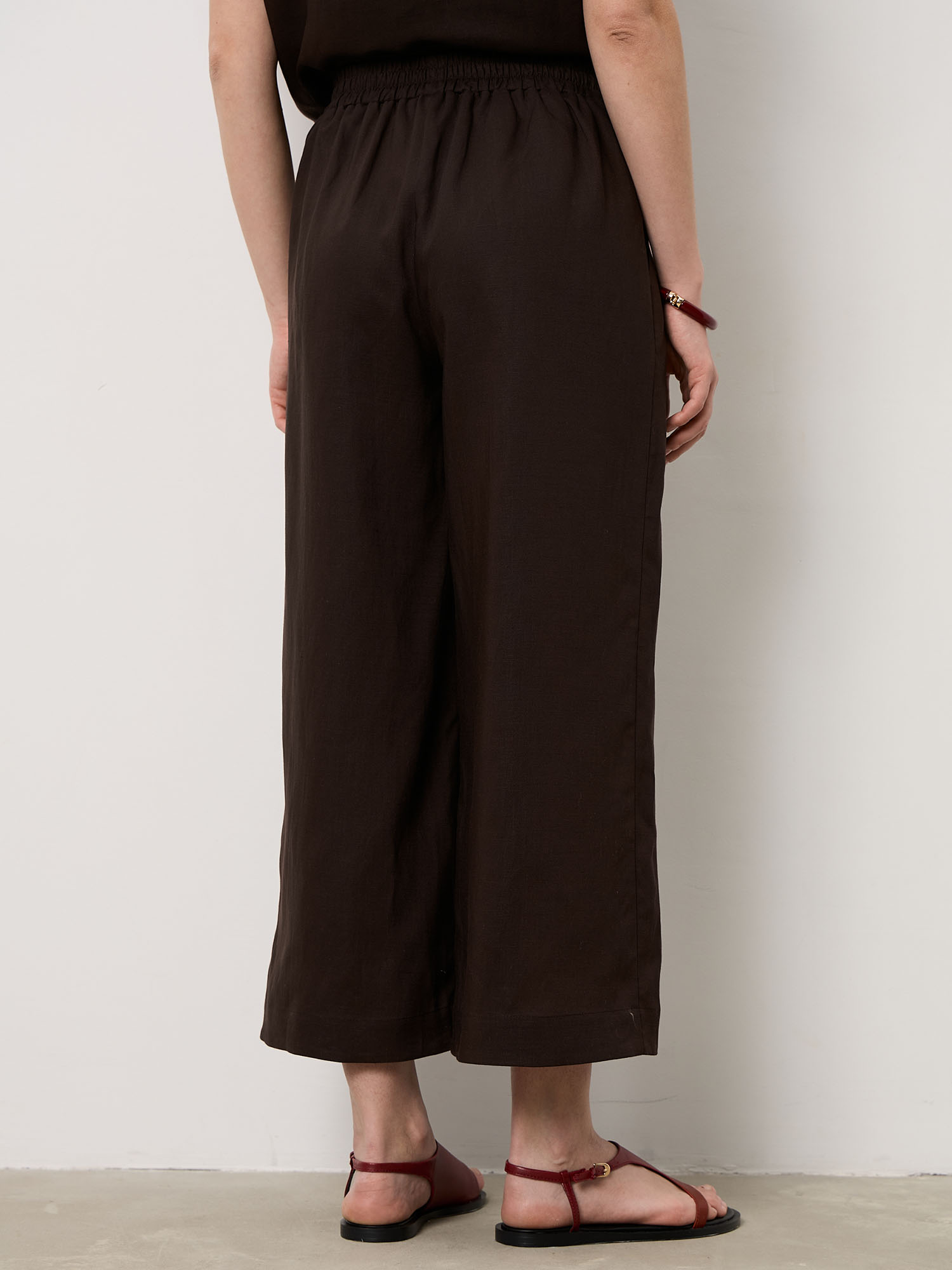 Комфортная посадка по талии и свободная линия брючин обеспечивают свободу движений. Лёгкая натуральная ткань приятно ощущается на коже и подходит для длительной носки.
