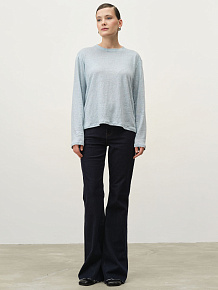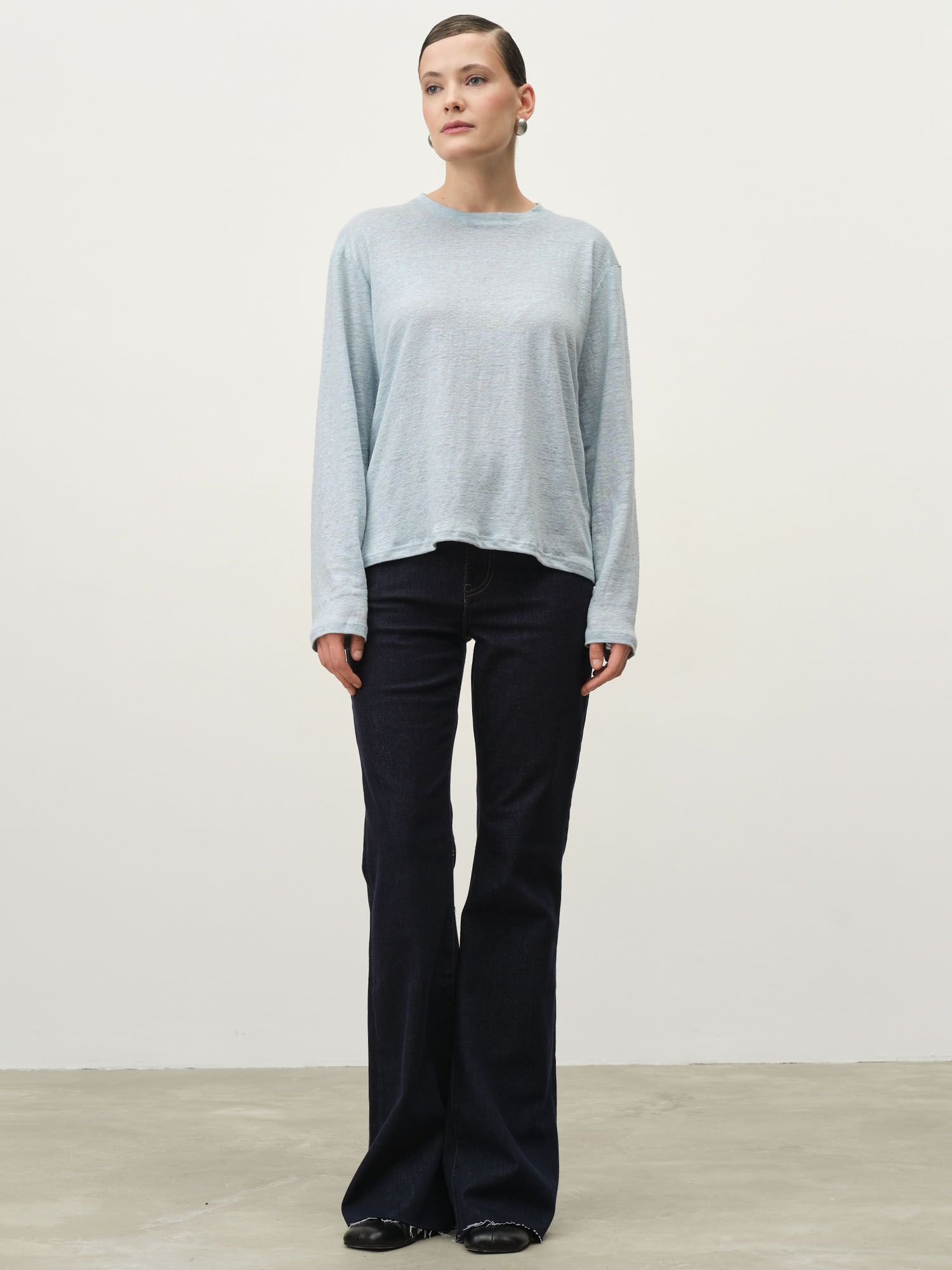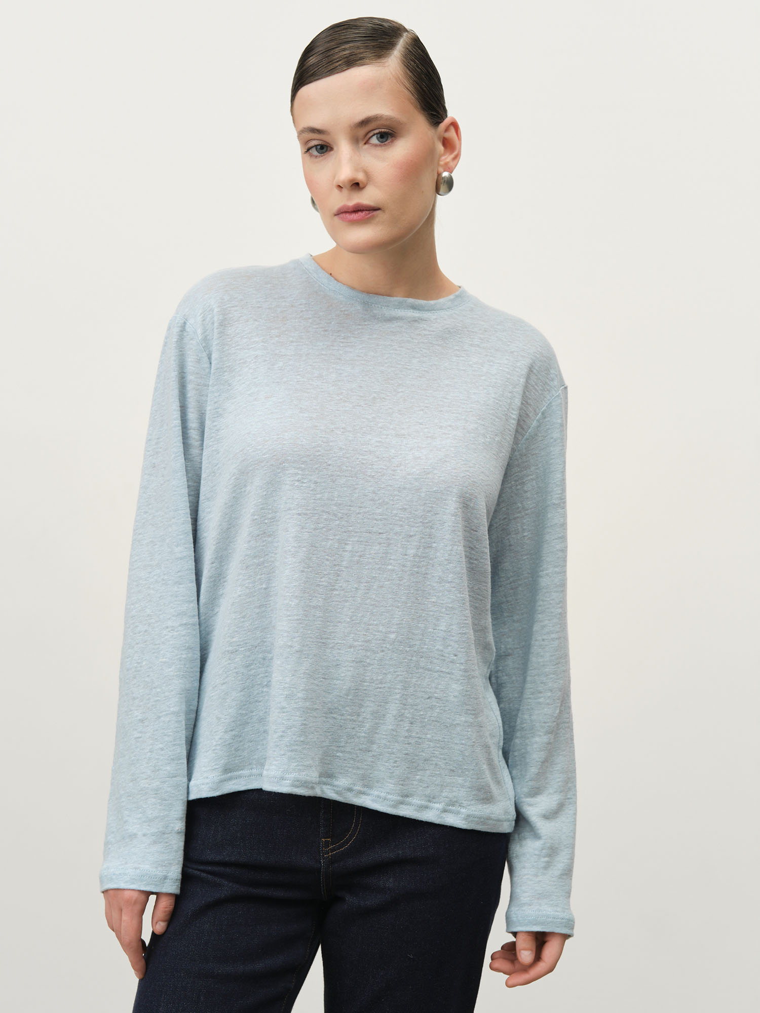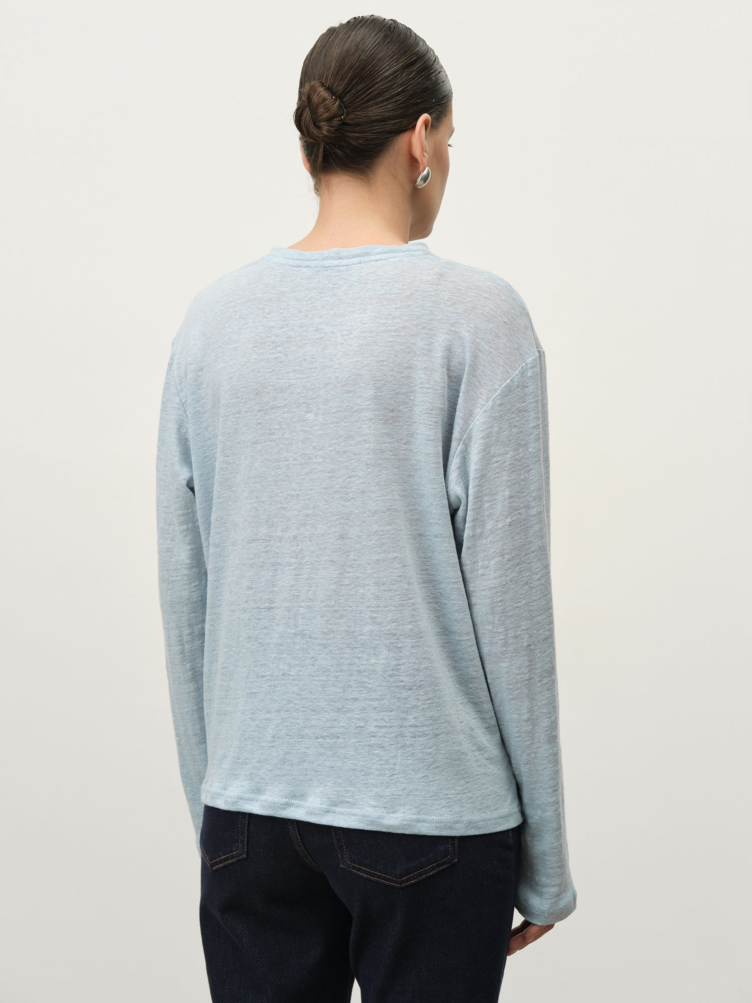 Голубой лонгслив из льна – легкость и комфорт в каждой детали. Натуральный материал дарит воздухопроницаемость и приятные тактильные ощущения, а свободный крой обеспечивает удобную посадку. Нежный оттенок добавляет образу свежести и универсальности.
