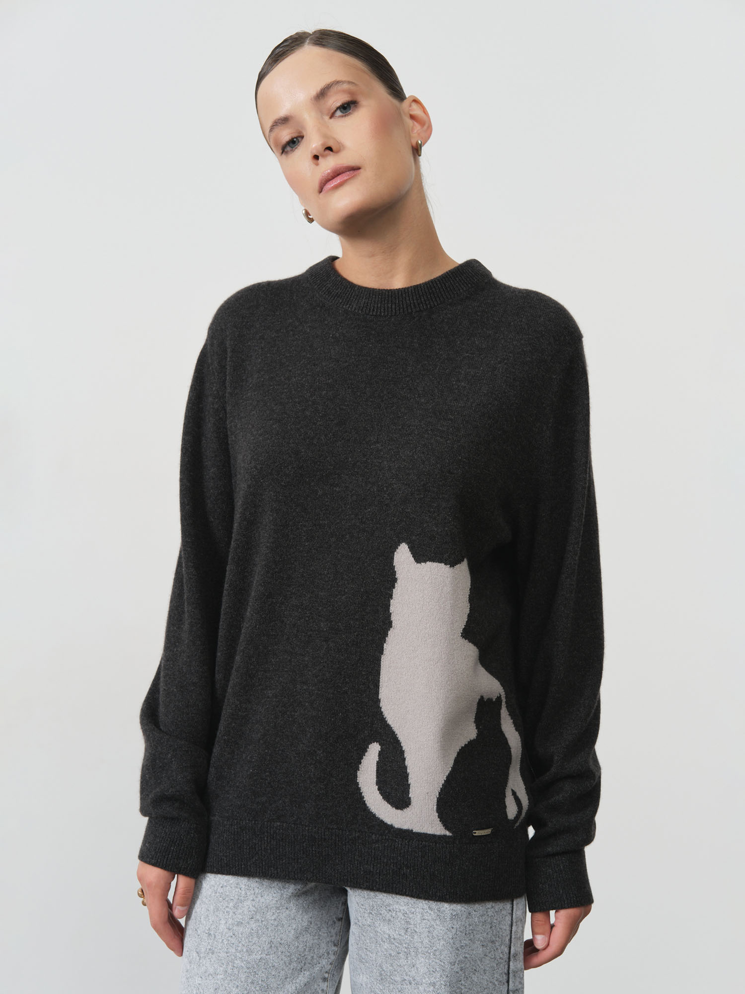 Свободный силуэт с классическим круглым вырезом. Контрастный жаккардовый рисунок добавляет индивидуальности и делает модель акцентной.