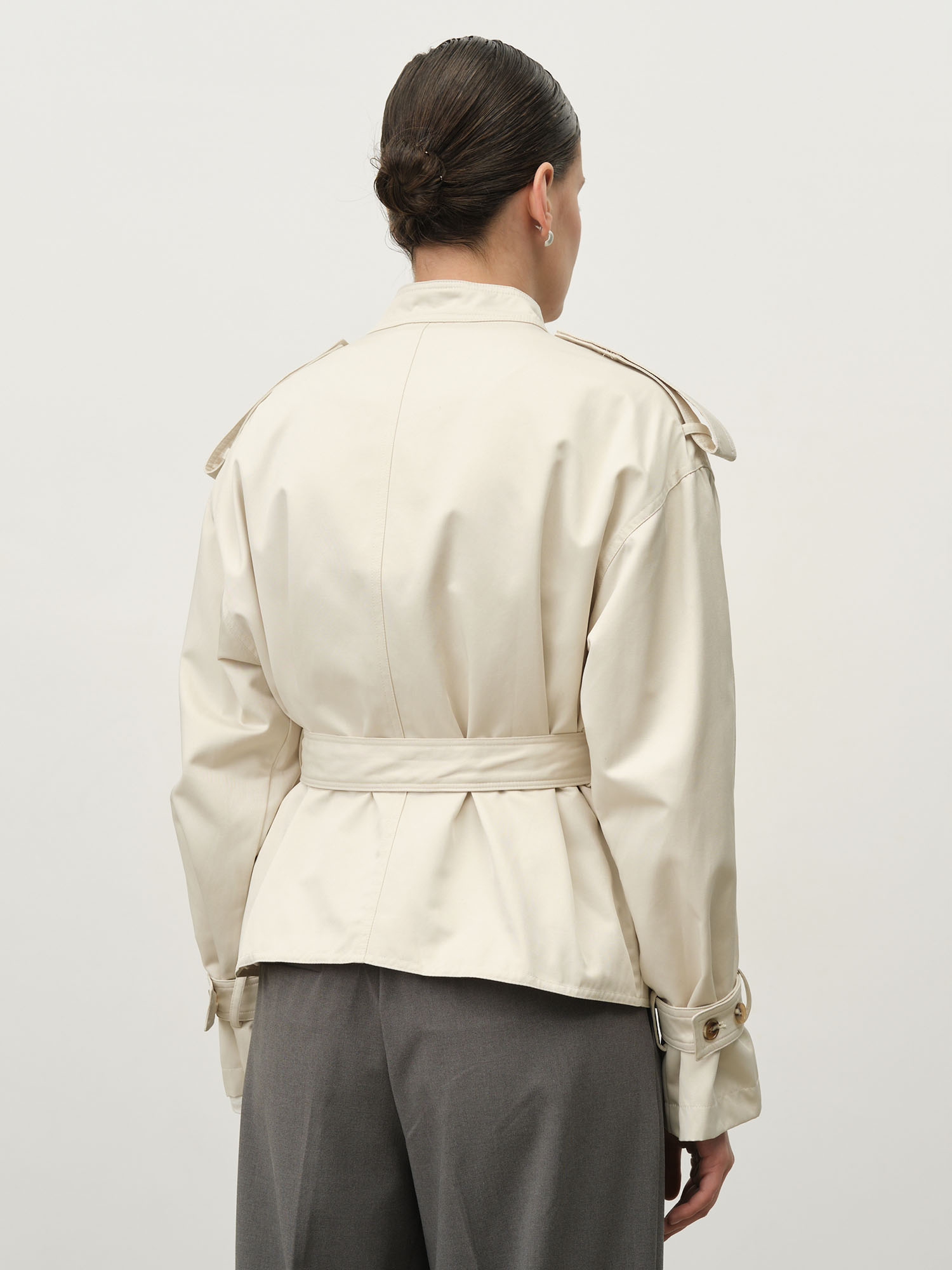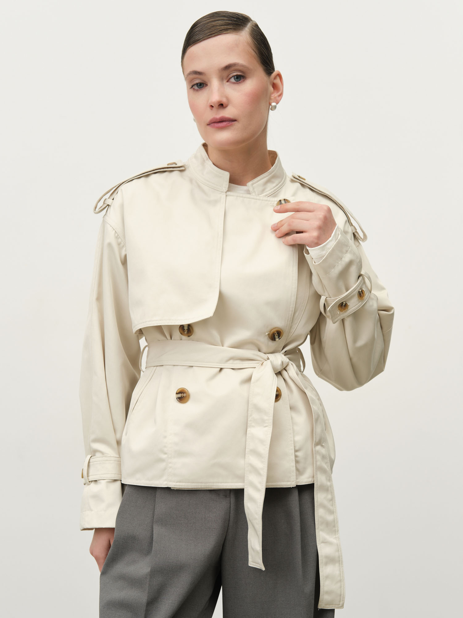 Приталенный силуэт с поясом, укороченная линия верха с декоративной кокеткой. Современная интерпретация классического тренча с выразительными элементами.